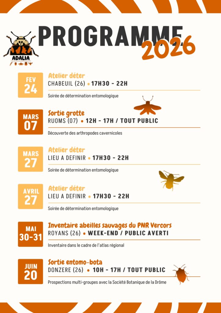 Nous souhaitons vous adresser nos meilleurs vœux pour cette nouvelle année.Que 2026 soit pour nous tou·te·s une année riche en découvertes entomologiques, en observations passionnantes et en moments de partage sur le terrain comme lors de nos soirées déter’. De notre côté, l’année démarre très fort avec la création officielle d’ADALIA – l’Association de Drôme-Ardèche pour L’étude… Lire la suite : Vœux 2026 - Lundi 15 décembre – Session détermination des abeilles