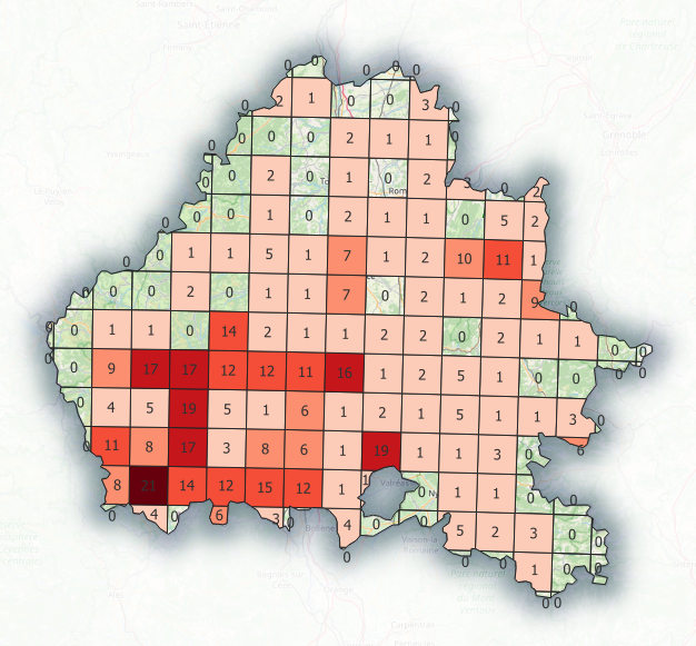 Cartographie du nombre d’espèces de Chilopodes connues par mailles en Drôme et en Ardèche en Janvier 2026